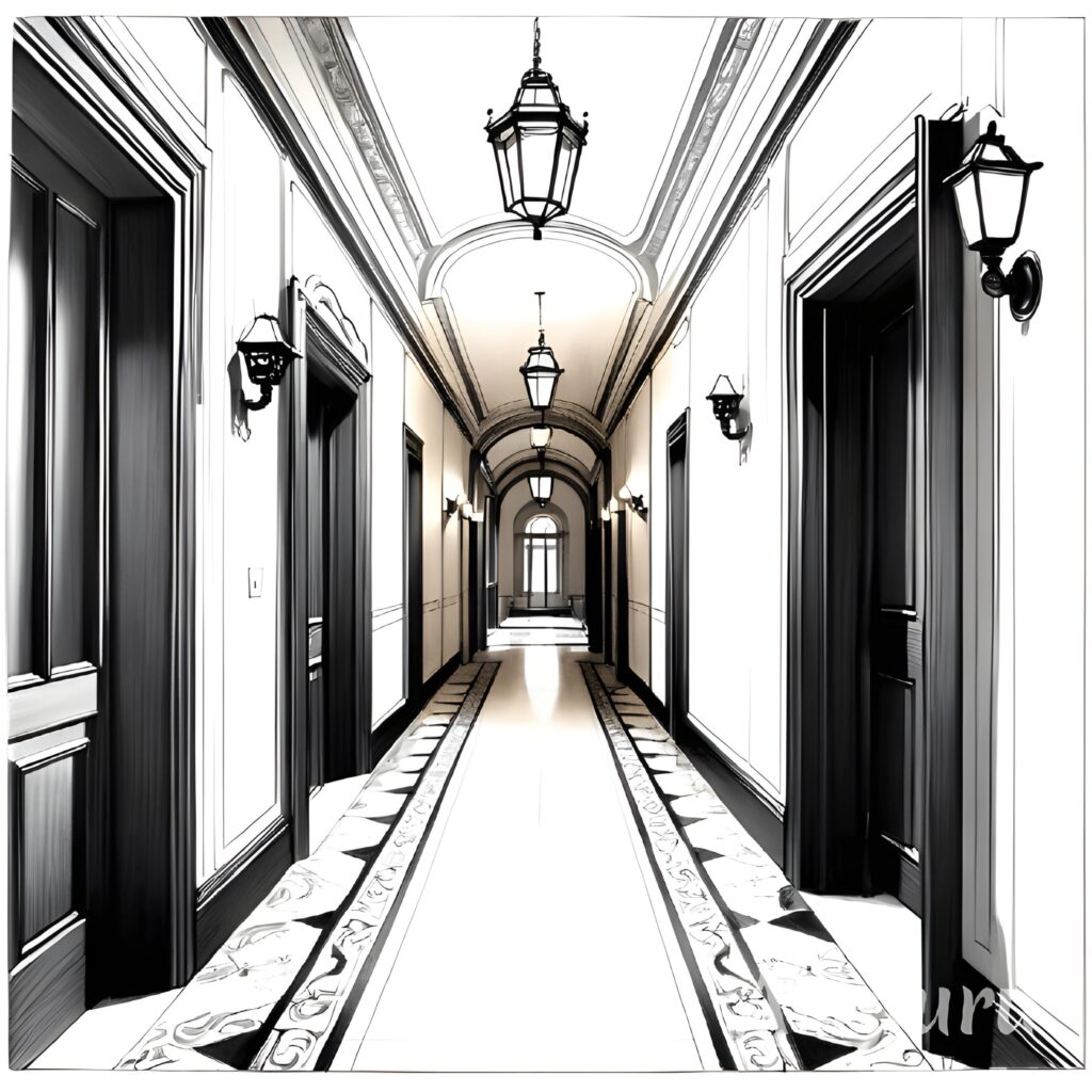 O Corredor é estreito e alongado, com piso de tábuas de madeira escura que rangem sob os passos