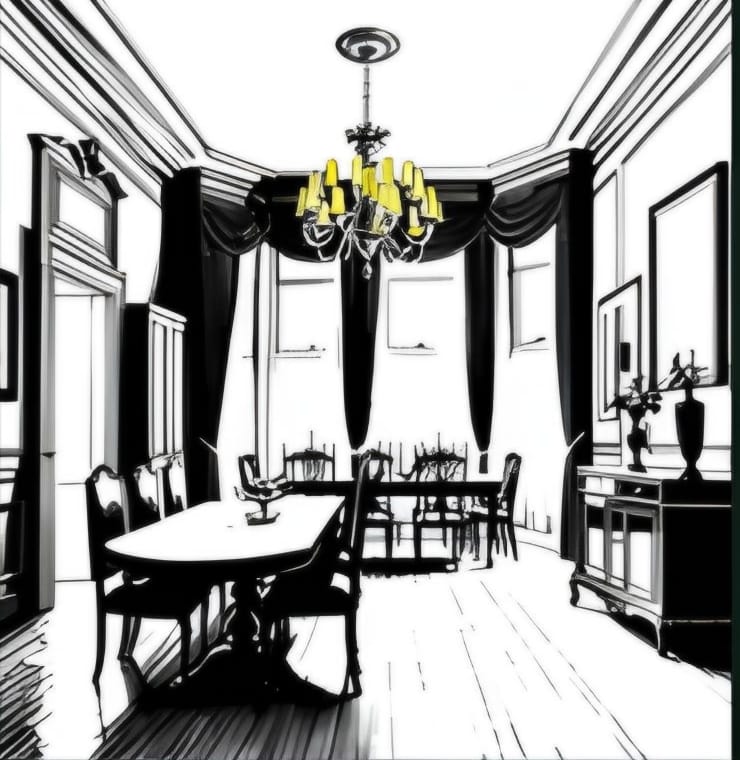 A Sala de jantar é ampla, com uma mesa de carvalho escura cercada por cadeiras clássicas estofadas. Um brilho elegante ilumina o espaço