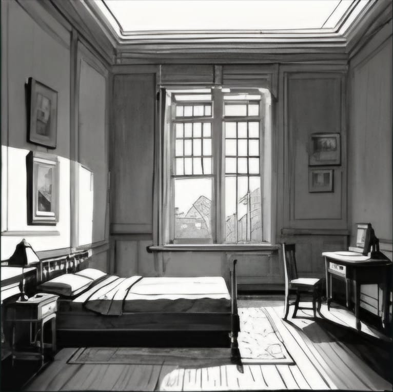 O Quarto de ezra é um espaço introspectivo, com paredes de papel de parede escuras e uma cama de dossel no centro. Uma escrivaninha de madeira